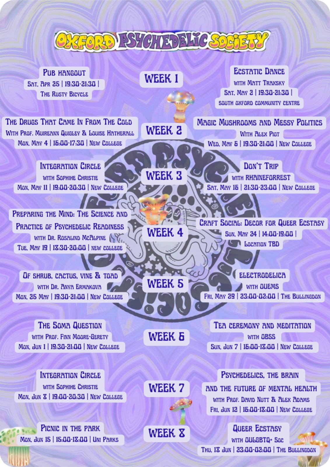 Welcome to the Psychedelic Society of the University of Oxford. We organise talks and events on medical research and public policy in psychopharmacology and psychedelic culture. Everyone is welcome! ♥
